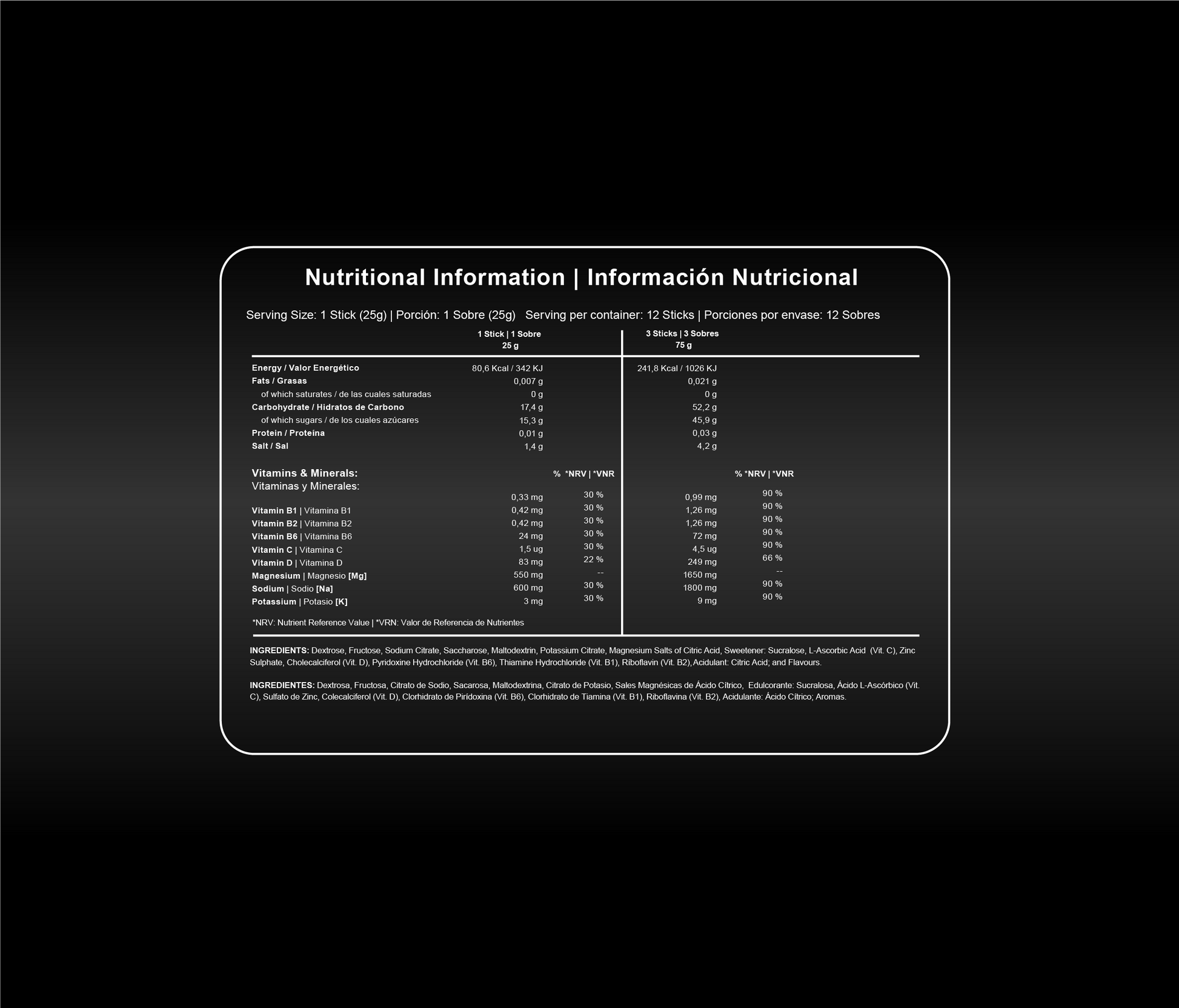 Modo de empleo: Disolver 1 sobre (25g) en 500 ml de agua y agitar hasta su completa disolución.
